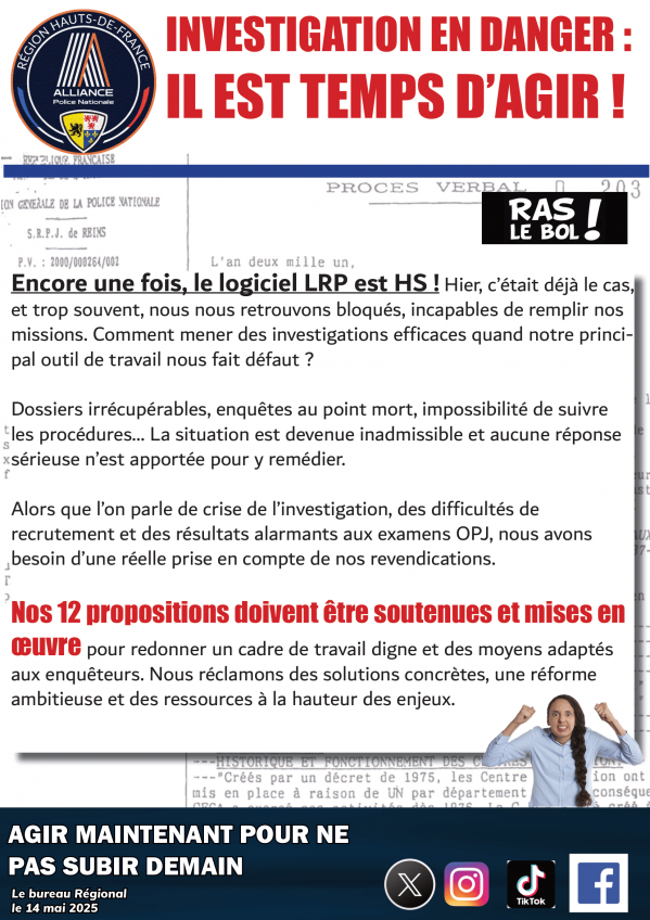 L’investigation est en crise, les services sont au bord de l’asphyxie, les conditions de travail inacceptables et le mal être au travail entraînent de nombreux arrêts maladie...