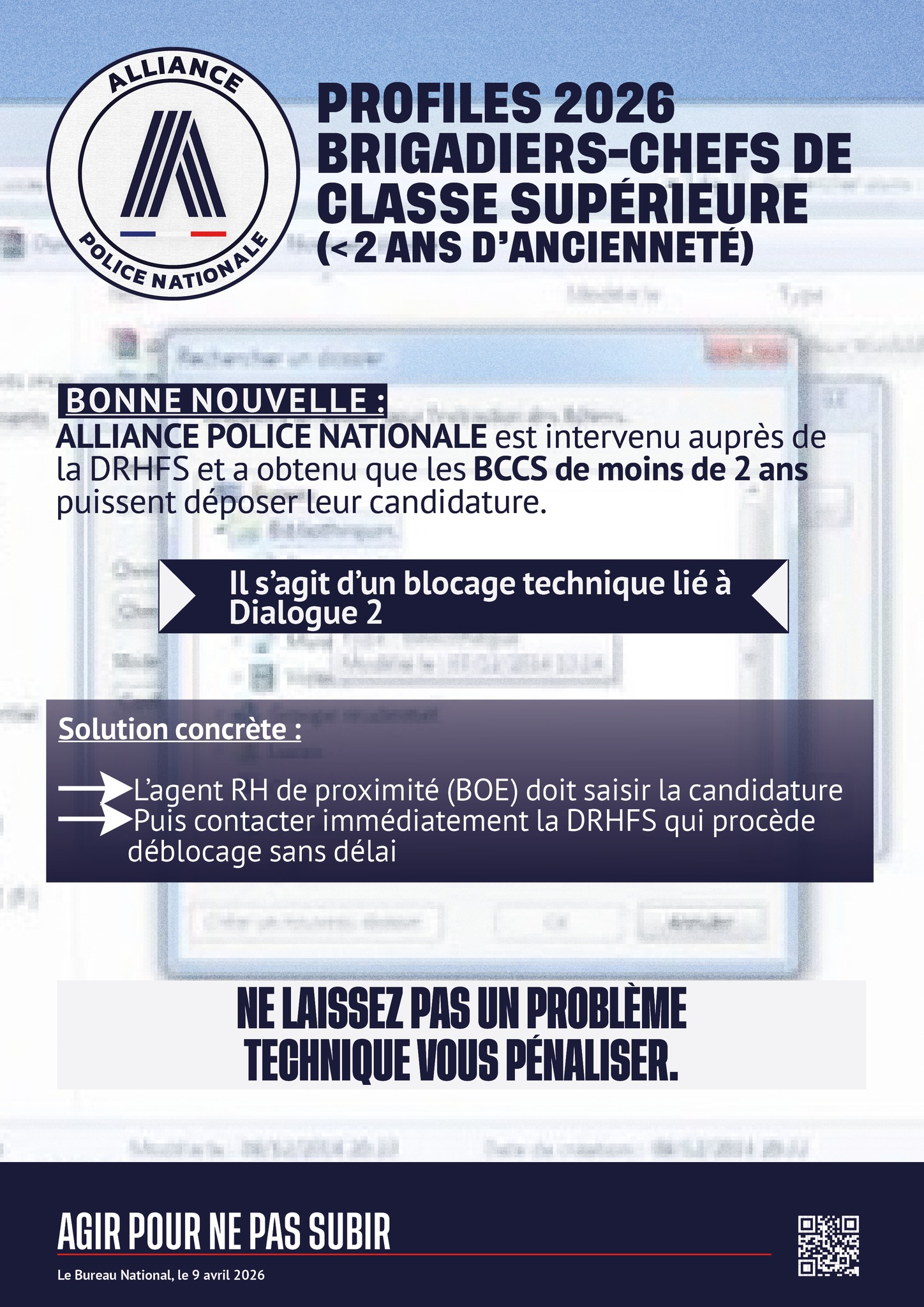 ✅ Bonne nouvelle : ALLIANCE POLICE NATIONALE est intervenu auprès de la DRHFS et a obtenu que les BCCS de moins de 2 ans puissent déposer leur candidature.